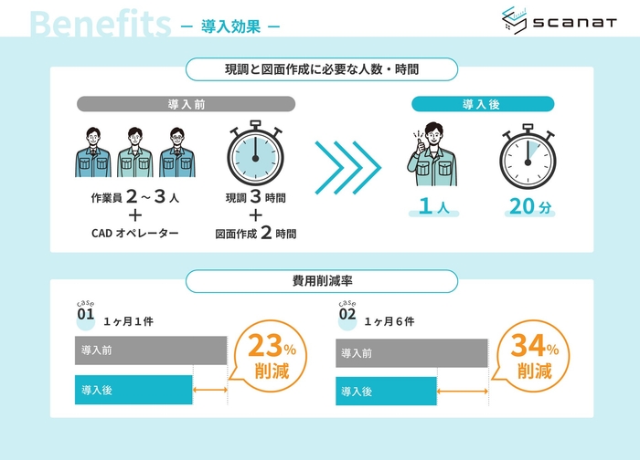 Scanat導入前後での費用比較検証では、図面作成1件/1ヶ月の場合で23%、6件/1ヶ月の場合で34%の削減*が見込まれます。図面作成機能はアプリ内の「CAD」ボタンを押すと図面の作成依頼画面へ遷移し、通常のサブスクリプション費用とは別でオプションでのご利用となります。