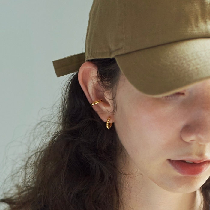 イヤーカフとピアスが組み合わさったようなデザインのSynchronize Pierceは、イヤーカフのように片耳でつけても、同じデザインのフープピアスと合わせて両耳でコーディネートしても良いマルチデザイン。「イヤーカフに興味があるけど落としそうで怖い」というピアス派の方にぴったりなアイテムです。