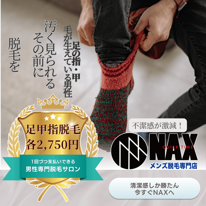 メンズ脱毛サロンNAXでは、足の甲や指の脱毛をリーズナブルな価格で提供しています。長くて不快なムダ毛を取り除き、清潔感と快適さを手に入れるチャンスです。プロの技術で、自信に満ちた足元を手に入れましょう!まずはお気軽にお問い合わせください。