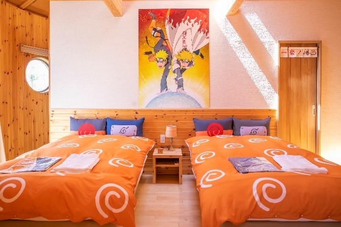 一棟限定のキャラクタールームNARUTOルーム「火影の別荘」は、人気アニメ「NARUTO」に登場するグッズやキャラクターが飾り付けられており、同作品の世界観を存分に楽しむことができるお部屋です。また、キャラクターが描かれたプリント浴衣やアメニティポーチなど、宿泊者限定のオリジナルギフトセットなども用意しております。ご家族、ご友人とともに、是非お楽しみください。