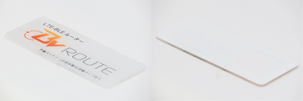 透明アクリル板の裏から印刷し、最後に白を印刷することで商品名プレートなども作成できます。
