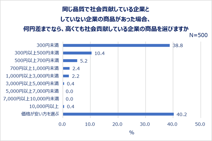 同じ品質で社会貢献している企業としていない企業の商品があった場合、何円差までなら高くても社会貢献している企業の商品を選ぶかも聞きました。その結果、約6割が、値段が高くても社会貢献している企業の商品を選ぶと分かりました。