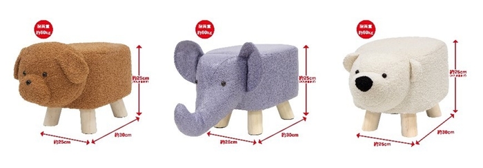 座ったり、飾ったりして楽しめる動物の形をしたスツールです。プードル、ゾウ、シロクマの3種類。
