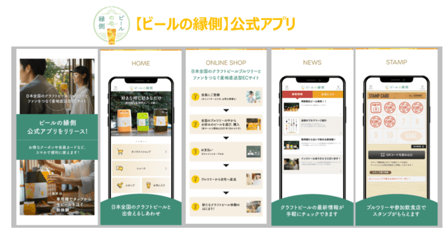 『ビールの縁側公式アプリ』も近日中にリリース予定です。オンラインショップと連動しているだけでなく、ブリューパブやブルワリー直営店などで貯まるスタンプカードなど、アプリ限定コンテンツも用意しています。ブルワリーの新着情報やオンラインショップで使えるクーポンなども配信予定。リリースタイミングについては、『ビールの縁側』サイトや縁側通信(メールマガジン)などでお知らせいたします。(※商品を購入するにはオンラインショップでの会員登録が必要となります)