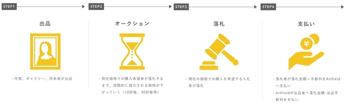 競り上げ型オークションとは異なり、出品作品の現在価格が段階的に下がり、購入希望者が希望価格で即座に落札する形式を採用しています。一人の買い手が意思表示することで即時に売買が成立し、スピーディな売買成立を楽しむことができ、オークションそのものがエンターテインメントとなります。オークション開催時にはリアルタイムの入札様子を実況中継いたします。