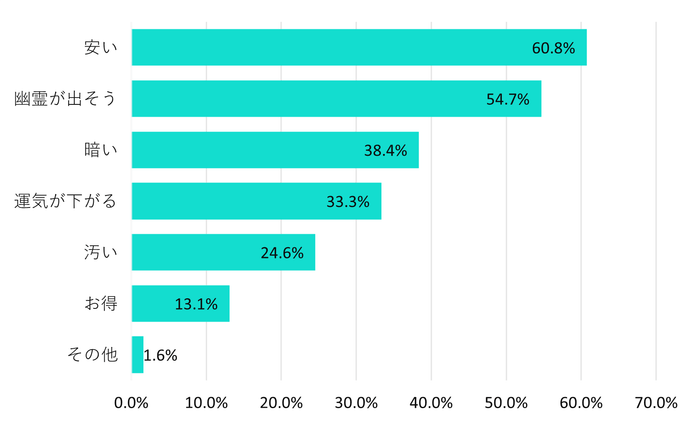 事故物件に対して、54.7%が「幽霊が出そう」、38.4%が「暗い」、33.3%が「運気が下がる」、24.6%が「汚い」といったネガティブイメージが多くあった。そんな中、不動産を実際に借りる・買うという目線では、60.8%が「安い」、13.1%が「お得」といった、プラスイメージの回答がありました。