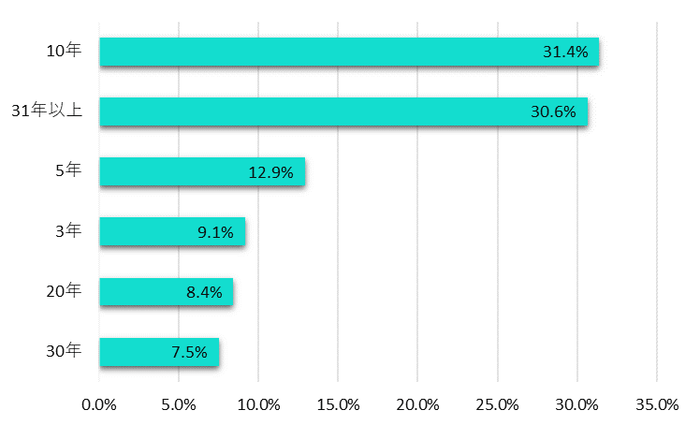 31.4%が「10年」、次いで30.6%が「31年以上」と回答。ガイドラインで設定されている「賃貸物件の場合、告知期間は事故発生から概ね3年」という期間について、本アンケートでは「3年」は告知してほしいと回答した方は9.1%に留まりました。