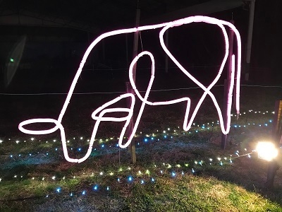6年目となる冬季夜間営業。今年は、当牧場の牛のイメージキャラクター「ゆめこちゃん」が考えたクリスマスライトアップというストーリーにて演出する夜の牧場をお楽しみいただけます。メイン会場は、ゆめこちゃんのおうちをテントで表現した「夜のファームタウン」。中央にはイルミネーションツリーや、動物たちをかたどったネオンライト(画像1)がお出迎えします。牧場ならではのイルミネーションとして、牛型オブジェ「光るモーモーさん(画像2)」も設置。大きな光の牛さんと記念撮影が可能です。これらの施工は専門業者をいれず牧場スタッフが手作りで設置いたしました。