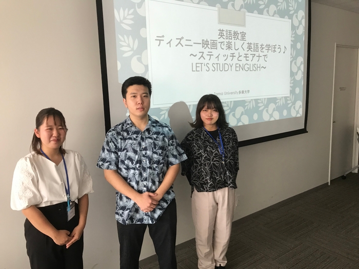 本学部生が担当した英語講座は小学生を対象とし、レベル別に2つのコースに分けて講義を開催いたしました。45分の初級コースは『ディズニー映画で学ぶ、英会話』と題して、モアナやリロ&スティッチの映画に出てくる会話を、アクティビティなど交えながら学ぶ講座でした。2回目の45分の上級コースは『ハワイ神話と、歴史・文化・自然』と題して、英語でのアクティビティやワークを交えながらハワイ神話と、歴史・文化・自然を紹介する英語講座でした。