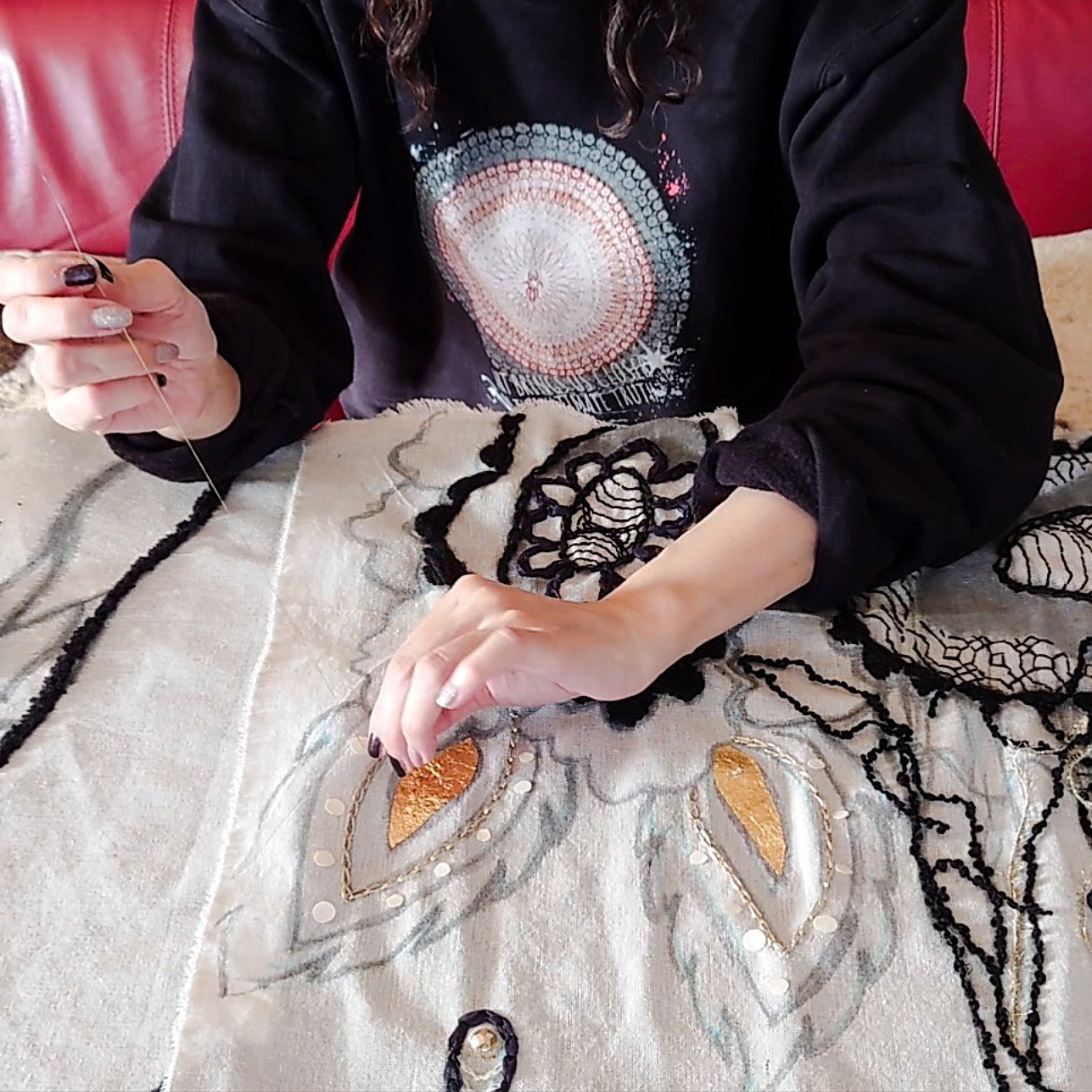 素材:オーガニックコットン、天然絹黒糸・金糸・銀糸・赤糸、墨、金箔、木製パネル、など