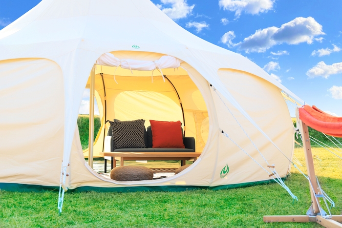 テントは空間をひろく使えるロータスベルテントを採用し、たまの湯の温泉入り放題+朝食付きプランをベースとして販売。
