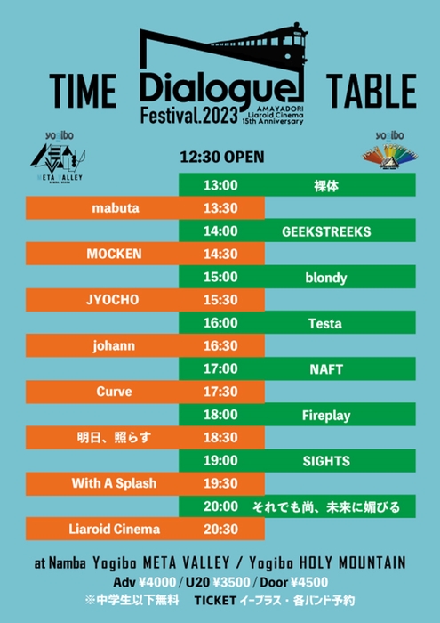 Liaroid Cinema 15周年記念として、初ライブの地である難波ROCKETS跡地に10/26よりオ ープンするYogibo META VALLEY / Yogibo HOLY MOUNTAINの2会場にて10年ぶりに主催 サーキットフェス「 Dialogue Festival 2023」を開催する。