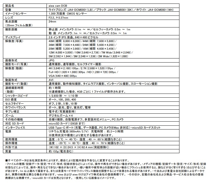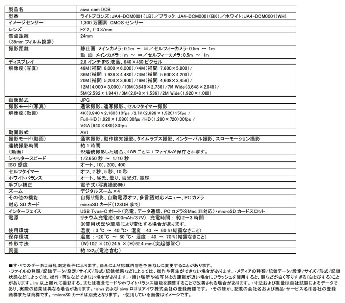 【aiwa cam DCB 主な仕様】