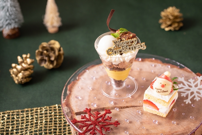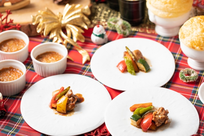 お料理は、クリスマスリースに見立てた6種の冷前菜らトリュフ香るマッシュルームスープの熱々パイ包みや、シェフが目の前でカッティングするローストチキン(昼時間)・ローストビーフ(夜時間)など、クリスマスシーズンのメニューにぴったりな品々をご用意。デザートはホテル専属パティシエ特製のチョコレートバナナパフェとショートケーキをお楽しみいただけます🎄