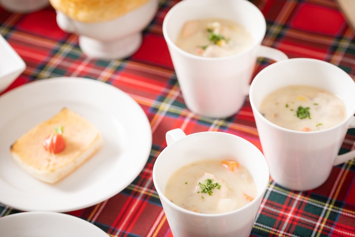 【温製】スペシャルツリー(手羽先 / ナゲット / イカリング / プチトマト) / サーモンと白菜のクラムチャウダー サワークリームオニオンのフレーバー / マッシュルームとトリュフのパイ包みスープ / 熱々ライスコロッケと生ハムのコンビネーション / チーズたっぷり牛頬入りボロネーゼのグラタン / あらびきソーセージとジェノベーゼのショーソン / インカの目覚めと明太子のスモーブロー 韓国海苔の香り / ベーコンとコーンの具だくさんキッシュ / 鶏の唐揚げと彩野菜のフリット 黒酢風味 / ローストビーフ丼 たまり醤油のソース