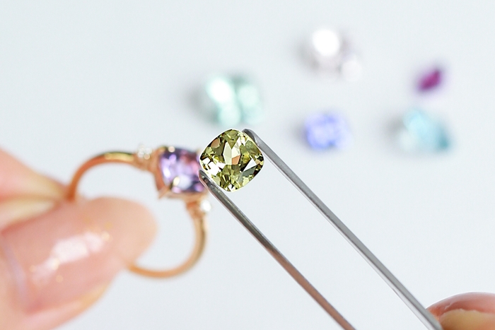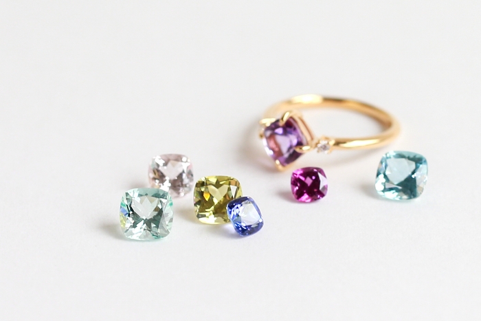 オレフィーチェ初の取り扱いとなる、クッションカットのカラーストーン。