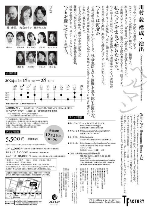 株式会社ティーファクトリー主催、『ヘルマン』が2024年1月18日 (木) ~2024年1月28日 (日)に吉祥寺シアター(東京都武蔵野市吉祥寺本町1丁目33番22号)にて上演されます。