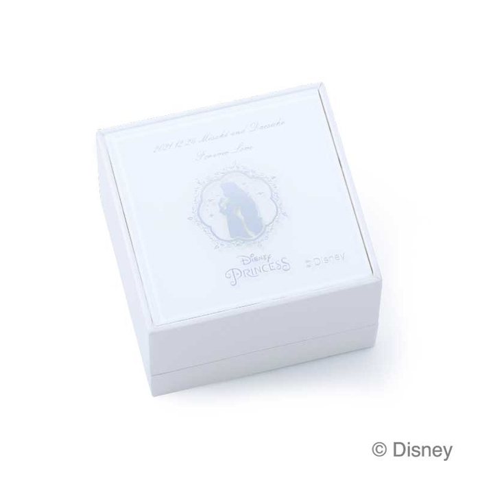 「ラプンツェル」がデザインされた専用のジュエリーボックスに、おふたりの記念日やお名前、メッセージ(3種類から選択)を刻印させていただきます。