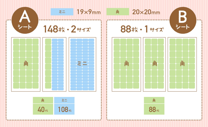 「大きめシールが沢山欲しい」「細かいところへ貼る機会がない」などのお声をいただき、2022年秋にBシートを追加しました。