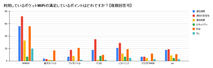 「利用している(利用していた)ポケットWiFiに満足している点はどれですか?」という質問に対しては、次のグラフの結果となりました。