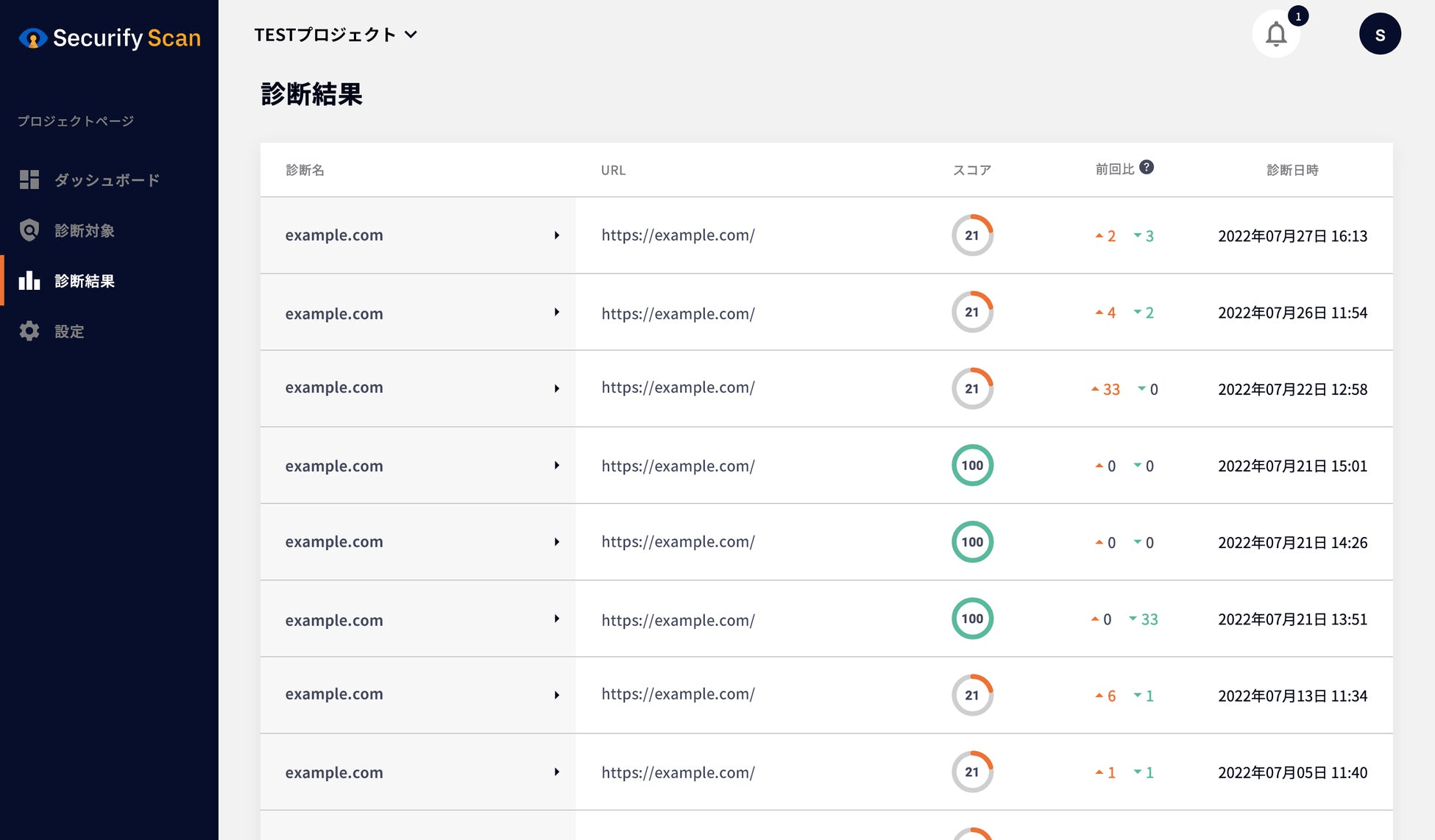 ・最新の診断結果や、診断の状況、発見された脆弱性の推移など、現在のステータスを直感的に把握できます。