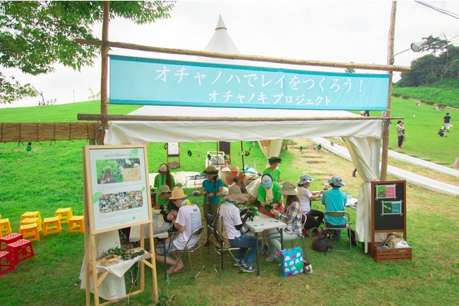 持続可能な社会を創るための活動を行なうap bankと、今回6年ぶりの静岡県掛川市での開催にあたり、地元掛川との協業を行っているオチャノキプロジェクトに賛同頂き、会場装飾及びオチャノハでレイをつくるワークショップを開催しました。