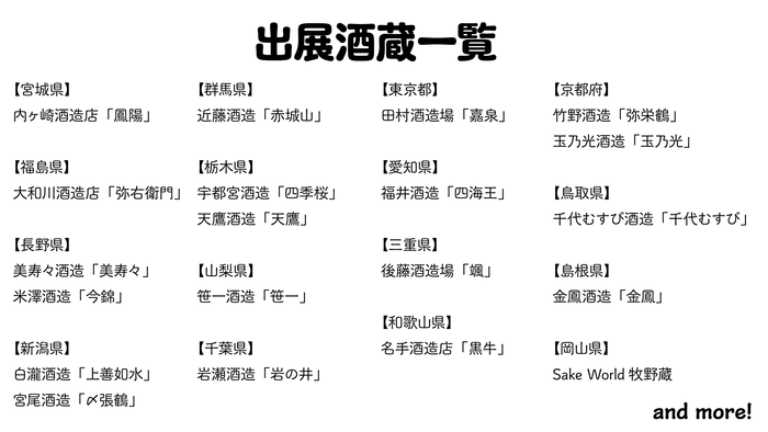 まずは、皆さまに日本酒のバラエティーの豊かさを知っていただき、様々な日本酒の魅力を楽しんでいただく機会を作りたいと考えております。もちろん、日本酒通の方にも十分ご満足いただける内容です。