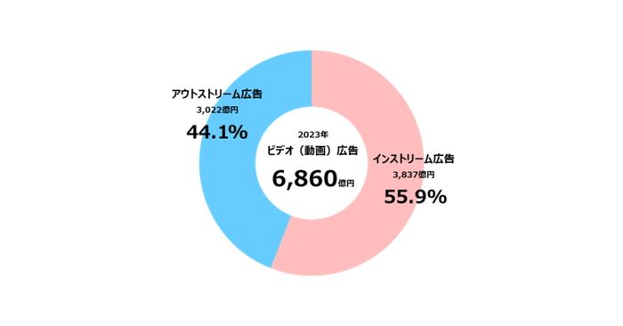 ビデオ(動画)広告は、前年比115.9%の6,860億円となり、広告種別の中で最も高い成長率となった。 内訳は、インストリーム広告 3,837億円、アウトストリーム広告 3,022億円。2024年も二桁成長を維持し、前年比112.2%の7,697億円になると予測する。