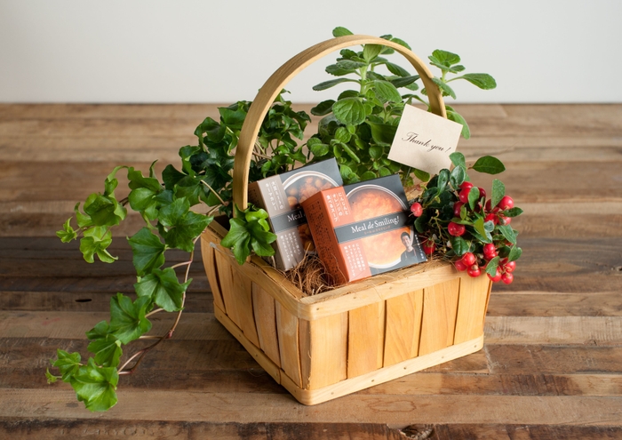 自分の庭からつみたてのような植物とハーブの寄せ鉢と、美味しい無添加常備食『ミールdeスマイリング』がセットになったギフト商品です。