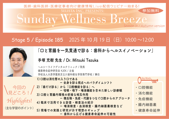 セリスタ株式会社(東京都千代田区 代表取締役 伊藤 承正)は、2025年10月19日(日)に、手塚 充樹 先生(ヘルシーライフデンタルクリニック/院長)を講師にお迎えし、医師・歯科医師などの医療従事者向け無料Zoomオンラインセミナー『口と胃腸を一気貫通で診る:歯科からヘルスイノベーション』を開催します。