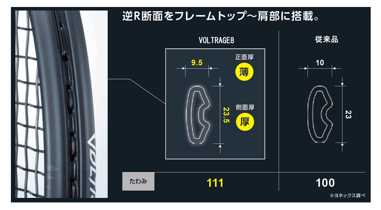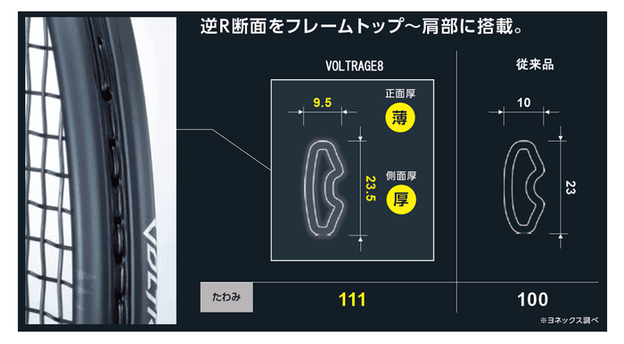さらに、VOLTRAGE 8には独自テクノロジーをシャフト部とフレーム部に採用しています。部分的に隆起させた新形状シャフト(特許出願中)により、しなりによる弾き性能はそのままに、ねじれを抑えてコントロール性がアップ。フレームは、逆R断面形状を採用。正面と側面の厚さを再設計することにより、打球時の衝撃を緩和させるとともに、高速スウィングに適した振り抜きの良さを実現しました。加えて、素早い復元力を生む新素材「2G-Namd™ Speed(ツージーエヌアムドスピード)」※をソフトテニスラケットに初搭載。高次元のしなり戻りが「さらなる弾き」と「高速レスポンス」を生み出します。