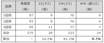 さらに、雌性発生によって得られたふ化仔魚を継続飼育し、8月28日、29日に275尾から採取した鰓粘液※6 を用いて、ZZ/ZWの遺伝型を判別した結果、WW(超メス)と推定される個体が8.7%存在することが分かりました(表3)。