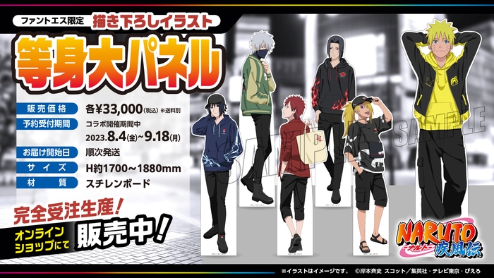現在、ファントエスオンラインショップでは、新規描き下ろしイラストを使用した「等身大パネル」とイラスト内でナルトとカカシが着用しているデザインの「スカジャン」を受注生産にて販売しております。