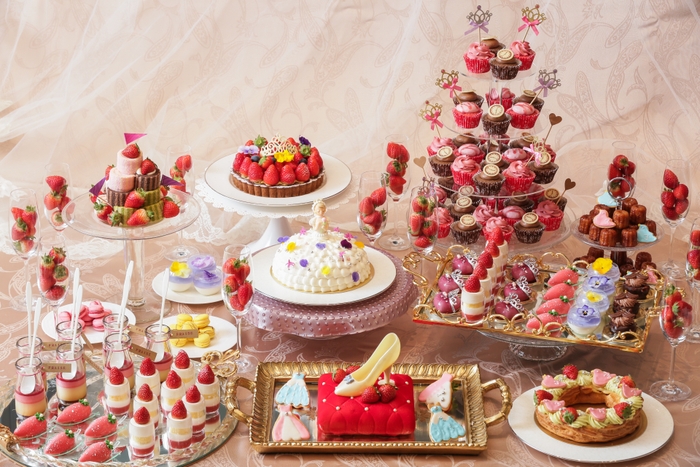 ガラスの靴といちごティラミス・シンデレラショートケーキ・ストライプロールケーキ・いちごたっぷりタルト・いちごとピスタチオのパリブレスト・タイベリーのハートムース・ストロベリームース・あまおうのキャンドルヴェリーヌ・ハーブティーのパンナコッタ・いちごプディング・カヌレ・マカロン2種(いちごとレモン)・サブレバニラ・季節のアイスクリーム・いちごとチョコのマフィンタワー・王様のチョコレートムース・プリンセス&プリンス ストロベリー食べ放題 など約20種