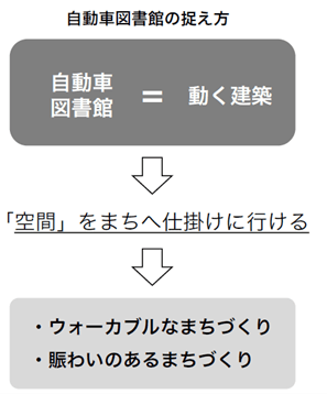 建築学の観点から、自動車図書館をどう位置づけるべきか。我々はそれを「動く建築」として捉えることにした。「動く建築」にできること。それは、空間という塊を持って、まちへ仕掛けに行けること。その先には、ウォーカブルなまちづくりや、賑わいのあるまちづくりに貢献できる。そんな力を秘めていると考えている。