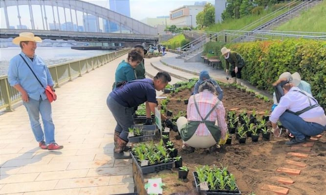 隅田川のオープンテラスにある花壇やプランターに花を植え、水やりなどの日常のお花のお手入れを定期的に行っているボランティアのみなさんです。