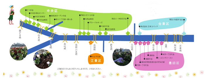 隅田川の両岸、隅田川テラスにある21か所の花壇のいずれかになります。