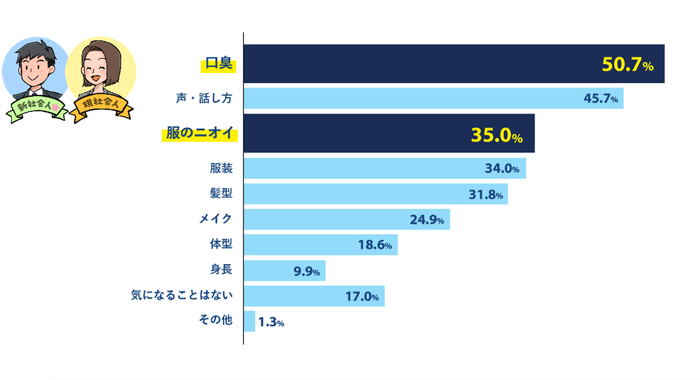 24年卒“コロナネイティブ世代”が新社会人に! 90%以上が対面時に気になることは「ニオイ」と回答 新生活シーズンを連想させる色は、やっぱり白!