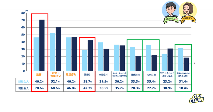 その結果、新社会人は全てまんべんなく心配ということがわかりました。それぞれ1位となった回答は、新社会人で「敬語・言葉使い(52.1%)」、現社会人は「挨拶(70.6%)」となりました。