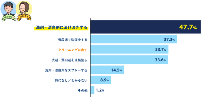 シミや汚れのケアについては、「クリーニングに出す(33.7%)」をおさえ、「洗剤・漂白剤で漬けおきする(47.7%)」が最多となりました。