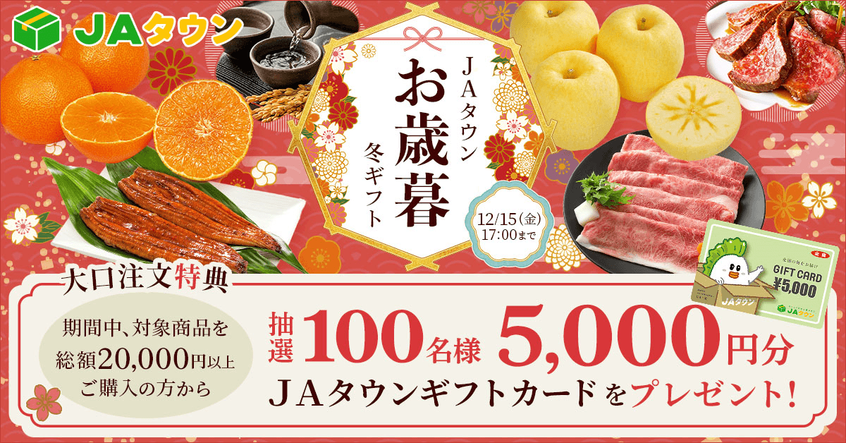 このキャンペーンは、10月2日(月)から12月15日(金)の期間で開催し、期間中、対象商品を総額2万円以上ご購入いただいた方の中から抽選で100名様に、JAタウンギフトカード5,000円分をプレゼントします。
