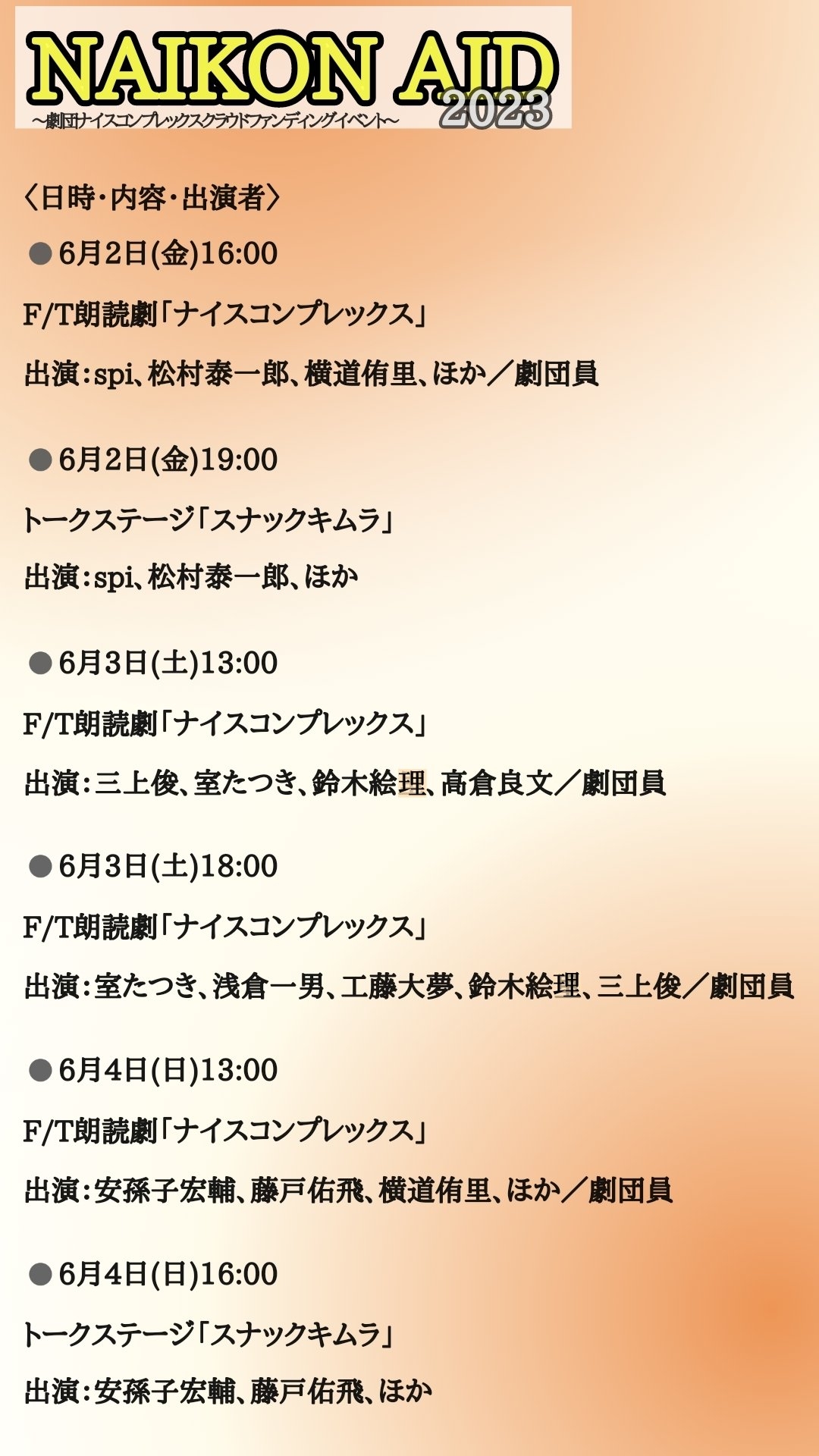 劇団ナイスコンプレックス(主宰:キムラ真) クラウドファンディングイベント『NAIKON AID2023』が2023年6月2日 (金) ~2023年6月4日 (日)に阿佐ヶ谷アルシェ(東京都杉並区阿佐谷南1-36-15レオビル地下1F)にて開催されます。また、2024年春の新作公演に向けたオーディションも開催します。