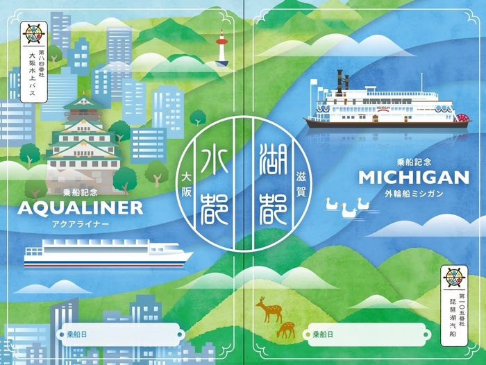 さらに、本プランご利用の方には、プラン特典として、「コラボ御船印」をプレゼント。「コラボ御船印」は、びわ湖と大阪、“水の路”で繋がる2つのクルーズをイラストで表現しており、各乗船窓口でお渡しする御船印を組み合わせると、1つの絵柄が完成するデザインです。