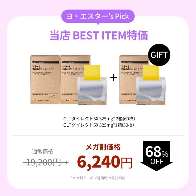 エスターフォーミュラの人気商品である「エラスチンオリジナル7X」と「GLTダイレクト5X」をより多くのお客様にお試しいただけるよう、2箱ご購入いただいた方にはさらに1箱をプレゼントする2+1特価イベントを実施いたします。メガ割ならではの特別イベントとなりますのでチェックしてください!