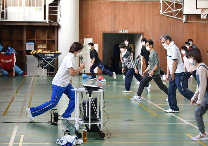受講者は「優しいトークで楽しかったです」「後で筋肉痛になりそうですが、よく体を動かすことができました」と満足そうでした。佐藤特任教授は「年齢を重ねていくと下半身が大事になってくるので、体幹を中心にあえてきつめの内容にして指導しましたが、参加した皆さんは健康運動の動きに慣れていて安心してできました」と振り返っていました。