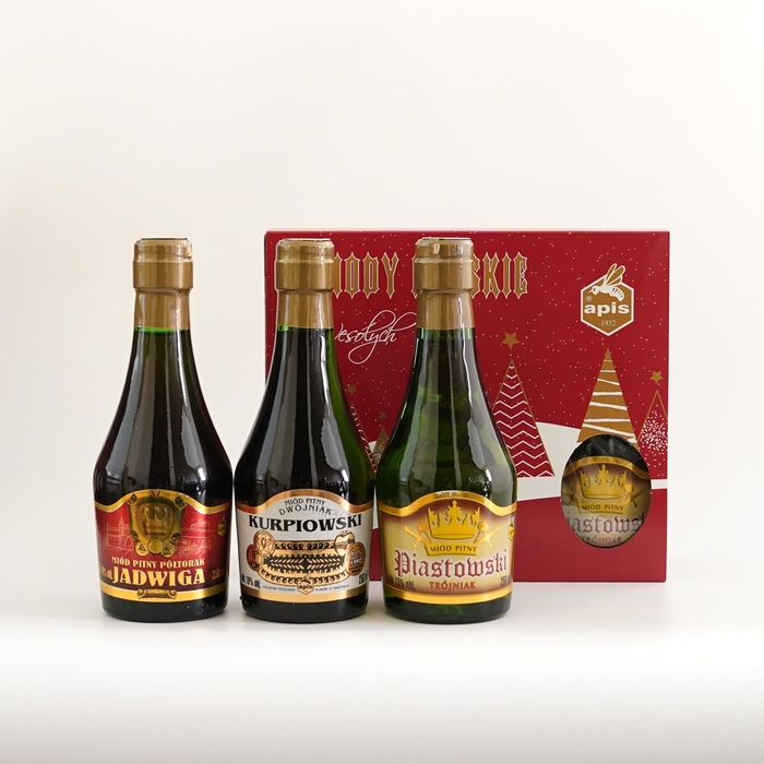 内容:ポーランド国内で人気の高い3種類、高濃度の「ヤドヴィガ」、中濃度の「クルピオフスキ」、あっさりの「ピャストフスキ」が250mlのミニボトルに。蜂蜜の濃度や味わいの違いがよくわかる、お試しや飲み比べのしやすい3本セットです。蜂蜜酒に縁のある17世紀ポーランドの名将が描かれたクラシカルなボックスに、クリスマス限定パッケージが被せられた特別仕様。可愛い見ためでプレゼントにも最適です。
