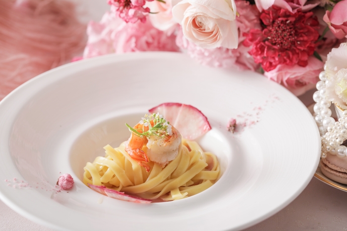 パスタは、“フェットチーネ”という平たく薄い生パスタを使用。マリー・アントワネットをイメージ。世界最高峰の品質の証明である「QUALICERT」の認定を受けた唯一の海老と言われる“天使海老”を使用。桜香る新玉ねぎのピューレと、魚介だしとにんにくオイルをまとわせたパスタを絡めて、お召し上がりください。