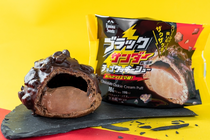 【内容】シュー生地に、ブラックサンダーの特徴であるザクっとした食感のココアクッキー生地とココアクランブルをトッピングし、チョコレートでコーティングしました。通常のクッキーシューより配合を変更し、最後まで食感が残る仕立てにしたココアクッキー生地です。チョコレートクリームには、厳選されたカカオ豆から作ったファミリーマートオリジナルのクーベルチュールチョコレートを使用しています。(カカオ豆の産地は主に、エクアドル、コートジボワール、ガーナ)