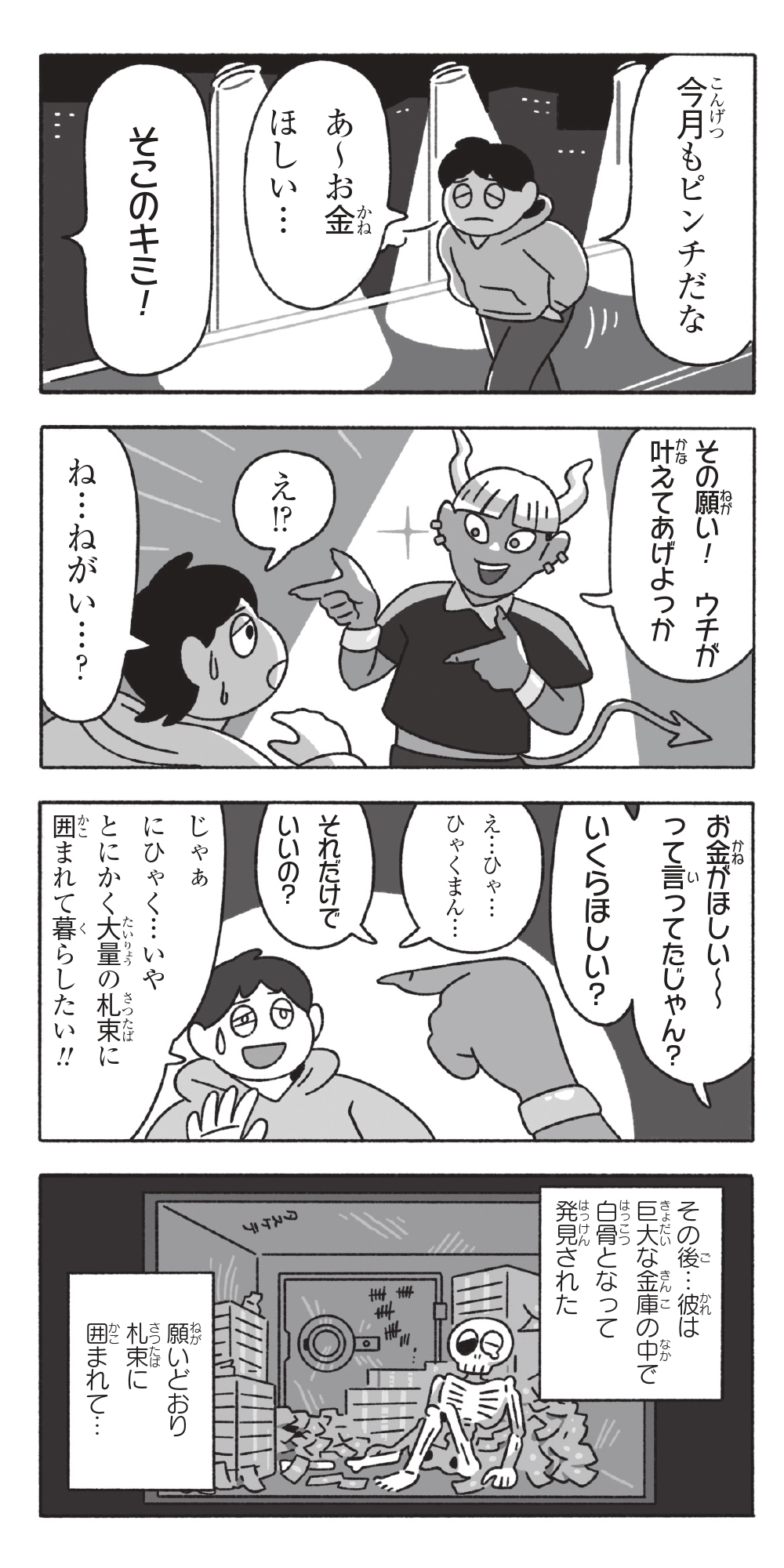 本書は、主人公のタロウが、空想と現実が交錯する街「エリア54」で起きる奇妙な事件に巻き込まれていく4コマ漫画54話を収録しています。4コマ漫画はシリーズイラストを担当する武田侑大氏が描き下ろしました。原作では名もなき登場人物だった悪魔や博士らに名前が与えられ、キャラクターとして描かれました。彼らはタロウが遭遇する事件へも関与しており、1冊を通して読むとわかるつながりやしかけも加えられています。本書で「54字の物語」を初めて読む人も、すでに読んだ人も、最後まで読むとそのしかけに気づき、「ゾクゾク感」が味わえる作品となっています。