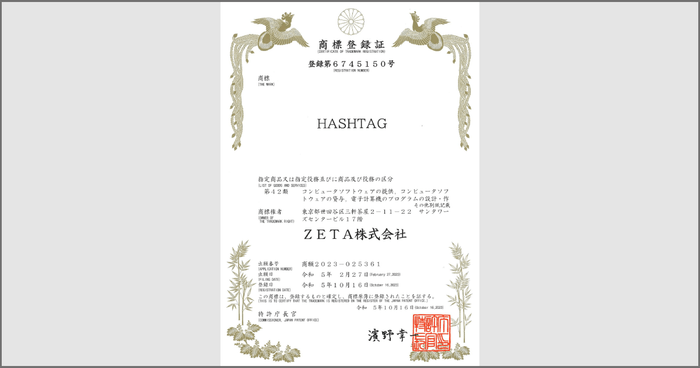 ハッシュタグ活用エンジン「ZETA HASHTAG」に関連する商標権を取得